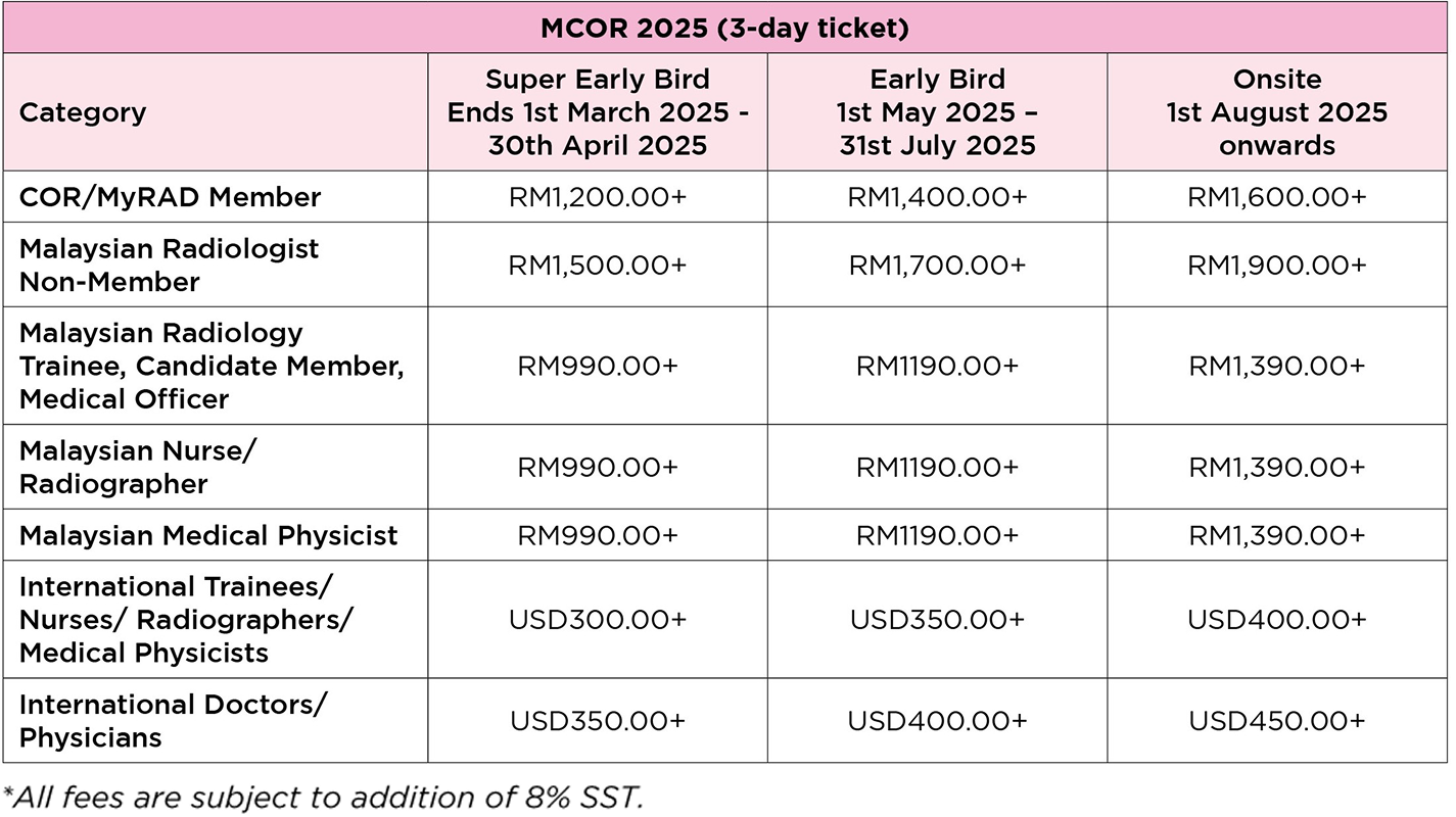 ** Malaysian Medical Officer / Radiology Trainee will need to attach a letter from the HOD as the Supporting Document for verification upon congress registration.